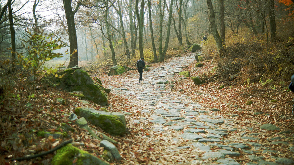 Mt. Manisan is known for its clearly marked trails, each offering a different kind of journey to the summit. We began our hike from the main Manisan Entrance (마니산입구), where a small ticket booth marks the starting point. After paying the ₩2,000 entrance fee, hikers are given a choice between two popular routes. The Gyedan-ro path, often referred to as the stairs route, is the more direct but demanding climb—lined with steep stone steps that challenge your legs while rewarding you with sweeping views early on. In contrast, the Dangun-ro trail takes a longer, winding approach through lush forest, following the gentle rise of the mountain ridge. This route, named after Dangun, the mythical founder of Korea, offers a quieter, more meditative trek for those who want to soak in nature at a slower pace. While these are the two main trails from this entrance, each step up Mt. Manisan still feels steeped in story, whether you push upward with intensity or wander thoughtfully through the woods.