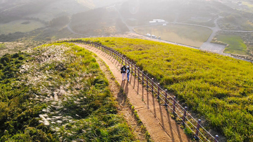 After soaking in the sunrise and capturing drone shots, we descended as more hikers began their climb. Saebyeol Oreum is popular because of its well-maintained trail and panoramic views. From the peak, you can see Mt. Hallasan standing tall, the sparkling sea, and other volcanic hills dotted across the island. Before leaving, we checked the silver grass, which wasn’t yet in full bloom, giving us a perfect reason to return in a couple of weeks. On our way to the next spot, we stopped at a horse farm, where some horses were grazing. We snapped a few photos before continuing our exploration. Our next destination was part of our Korean silver grass tour, which we’ll share in detail in a future blog post.